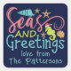 Seas And Greetings Beach Sommer Weihnachtsmarkt Stickers enthält den Text "Seas and Greetings" in modernen Kalligraphie Skript Typografie mit einem festlichen Seepferd und Muscheln mit Ihrem personalisierten Namen. Erstellt von Evco Studio www.zazzle.com/store/evcostudio