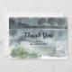 Die Dankeschön-Karte zeigt eine Seenlandschaft mit zwei wunderschönen Schwänen und der typischen Vegetation. Der geschriebene Teil wird oben auf der Karte platziert, um nicht den bedeutendsten Bereich des Designs abzudecken: die beiden Schwäne, die trotz der schwarzen Wolken am Horizont, ruhig in ihrem See leben.