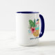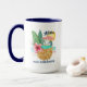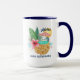 Die Tasse zum Thema tropische Strände besteht aus einem Aquarell-Seepferd mit Ananas (mit Blätter aus Palmen und Hibiskus), einem Swimmingpool mit Sonne, Meer und Seestern im Hintergrund, und "Aloha" und "Mele Kalikimaka" Grüße. Kunst von KL Stock
