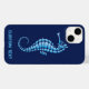 Stilisierte blaue Ikone eines Seepferds. Eigener Text.