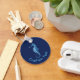 Stilisierte blaue Ikone eines Seepferds. Benutzerdefinierte Hintergrundfarbe. Benutzerdefinierter Text auf beiden Seiten.