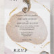 Eine wunderschöne Einladung in einem Wald, Aquarellfarben mit einem braunen und smaragdgrünen Seepferd und Gelefisch mit langen, fließenden Tentakeln, umgeben von Imitaten Rose Gold Glitzer Set vor einem weißen Hintergrund mit blassrosa und bedruckten Glitzern aus Goldblatt. Im unteren Drittel befindet sich eine Antwortkarte mit personalisierter uAwg und staubiger Topaz-Hintergrund, die Ihre Gäste abschließen können. Diese sind ideal für Hochzeitsfeiern zum Thema Strand. Partys zum Jubiläum an der Küste und Veranstaltungen zum Thema Meer.