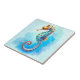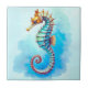 Keramik Kacheln in einem Aquarell-Design eines sonderbaren, farbenfrohen Seepferds mit Bräune, Türkis und Aqua-Farben. Der gepflegte Schwanz und die holprige Konsistenz verleihen ihm eine ganz besondere Note, und der türkisfarbene Hintergrund verleiht ihm ein traumhaftes Unterwasser-Ambiente.