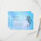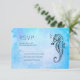 RSVP-Hochzeitskarte mit einer schwarzen Farbskizze eines Seepferds und einer Muschel. Der Hintergrund ist eine hübsch blaue Aquarelltextur.