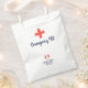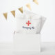 Eine Tasche für das Emergency Kit (alias Hangover Kit), um eine Begrüßungstasche in der Hochzeit in Urlaubsort zu stecken, mit einem Medikament im Inneren. Das rote Kreuz hat eine Korallenfarbe. Der Text ist dunkelblau. Der Titel "Emergency Kit" und die Namen der Braut und des Bräutigams sind in Skripten geschrieben. Über den Namen gibt es ein Korallenpaar Seepferde.
