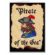 Linda Baysinger Pecks Gemälde eines Pirat Kapitän, auf Pergament Hintergrund. Im Text steht "Pirate of the Sea". Tolle Karten für diejenigen, die Renaissance-Feen und schmuckige Abenteuer genießen. © Linda Baysinger Peck Alle Rechte vorbehalten