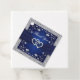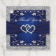 Diese quadratische Gastgeschenk Hochzeit danke Ihnen Tags sind tiefblau und silber in Farbe mit einem Schleifenbild in der Mitte auf der Vorderseite mit silberfarbenen Blume über und unter dem Band. In der Mitte ist ein Paar Juwel und simulierten Glitzer verbunden Herzen brooch. Der Rücken ist grau mit marineblauen Blumen und anpassbarem Text, der sagt: "Danke, dass du unseren besonderen Tag mit uns geteilt hast!", zusammen mit dem Namen der Braut und des Bräutigams und ihrem Hochzeitstag.