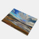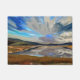 Ein Kunstdesign eines Sees mit dem dramatischen Himmel, der sich im Wasser des Sees widerspiegelt. Berge und Felder umgeben den See.