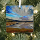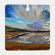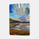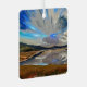 Ein Kunstdesign eines Sees mit dem dramatischen Himmel, der sich im Wasser des Sees widerspiegelt. Berge und Felder umgeben den See.
