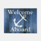 Seefußmatten-Sprichwort "Willkommen an Bord" in des weißen Textes, der blaue hölzerne Planken kennzeichnen und eines Seeankers im Weiß. Zuhause ist, wohin Sie Ihren Anker fallenlassen. Machen Sie einen warmen einladenden Eindruck auf Ihren Hausgästen mit dieser rustikalen Küstenfußmatte.