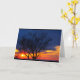 Eine Orange, ein Gold und lila ein Seesonnenuntergang, fotografiert durch einen sehr hohen Baum, ist das Thema meines "Denkens an Sie" Karte. Ich nahm diese Szene entlang der Küstenlinie schönen SeeWinnebago in Quinney, Wisconsin gefangen.