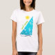 Die Illustration auf diesem T - Shirt mit einem tropischen Gefühl kennzeichnet ein Türkissegel auf einer blauen Marinewelle unter einer hellen gelben Sonne. Entwerfen Sie verfügbares auf Tragetaschen auch, großes für den Strand oder die Bootfahrt!
