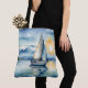 Ein Aquarell-Gemälde eines Segelbootes gleitet friedlich über das ruhige Wasser, während die Sonne Sets, ein warmes Licht und Reflexionen auf der Oberfläche