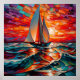 Eine lebendige und farbenfrohe Darstellung eines Segelbootes, das durch ein wavy Sea gleitet, Set gegen einen dramatischen Sonnenuntergang, der mit Orange, Rosa und Türkis überflutet ist. Das Kunstwerk besticht durch fette Formen und einen abstrakten Stil, der Bewegung und Ruhe schafft.