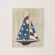 © Avery Tillmon/wildes Apple. Segelboot mit amerikanischer Flagge auf hölzernem Hintergrund