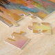 ein dekoratives Aquarellwerk eines Segelbootes, das unter einem farbenfrohen Sonnenuntergangshimmel auf dem Ozean treibt, mit bunten Reflexionen im Wasser als Puzzle.