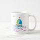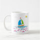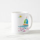 Segelboot und Roter Fisch Ein buntes Segelschiff navigiert durch ein Meer von stilisierten Wellen, umgeben von roten Fischen und begleitet von einer strahlenden Sonne fliegenden Vögeln