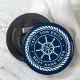 Ein weißer, eleganter Schiffszillator mit Seilschild und dem Namen Ihres Kapitäns und Bootes auf dunkelblauem Hintergrund.