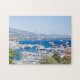 Dieses Rätsel hat viele verschiedene Arten von Booten an einem Dock mit Bergen im Hintergrund.