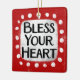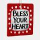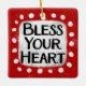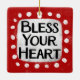 "Bless Your Heart" ist ein niedliches Textdesign in rot mit schwarzem Text, zusammen mit einer weißen Akzent-Form und weißen texturierten weißen, weißgetönten weißen Punkten, die ihn umgeben.