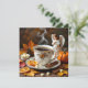 Hübsches Herbstthema Begrüßung Notenecard Sprichwort, "Versenden Sie Ihre Herbstsegmente" für einen Freund oder Familienmitglied. Eine ai-Abbildung einer warmen Kaffeemaschine-Tasse, Orangenscheiben, Zimtsticks, umgeben von Herbstlauben und Kürbis.