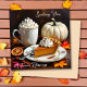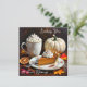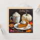 Hübscher Fall Thema Grußkarte Sprichwort, "Senden Sie Ihre Herbstsegmente" für einen Freund oder ein Familienmitglied. Eine helle Illustration einer leckeren Herbstszene mit einem Kürbiskuchen und Sahne auf einem extravaganten Vintagen Teller, einer Tasse heißen Kakaos mit Kürbiscreme und einem weißen Kürbis, umgeben von Zimtarsticken und getrockneten Orangenscheiben.