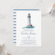 Elegante Babydusche-Einladungen für kleine Segler auf dem Weg bieten eine Aquarellillustrierung eines Leuchtturms in Marine, Rot und Weiß auf einem aquamarinen Meer, die Ihre Babydusche Details in schicken nautischen Marine blauen Buchstaben.