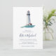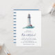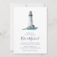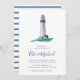 Elegante Hochzeitseinladungen an der Küste bieten eine Aquarellillustrierung eines Leuchtturms in Marine, Rot und Weiß auf einem aquamarinen Meer, die Ihre Hochzeitsdetails in schicken nautischen Marine blauen Schriften.
