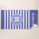 Trendy Cabana Streifen Strandtuch in Sehr peri (blau violett Schatten) und weiße gestreifte Muster mit Ihrem Monogramm in einem abstrakten Periwinkelkreis und Namen.