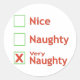 Drei grüne Karo mit den Worten Nice, Naughty und Very Naughty in roter Schrift neben ihnen, das Feld für Very Naughty wurde mit einem "X" oops sorry Santa überprüft!