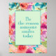 Niedliches und mädchenhaftes Plakat mit inspirierendem Text: "Sei der Grund, warum heute jemand lächelt" auf einem schönen, farbenfrohen, rosa, lila und korallenfarbenen, blumigen und aquamarinen Blätter auf einem minzgrünen Hintergrund.