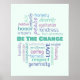 Ein farbenprächtiges Wort "Wolkendesign" mit dem Text "Be the Change" in der Mitte, umgeben von Wörtern wie Frieden, Liebe, Güte, Mitgefühl, Integrität, Ehrlichkeit und Großzügigkeit, die positive Eigenschaften und Aspekte widerspiegeln, von denen die Welt viel mehr nutzen könnte.