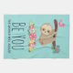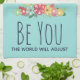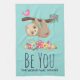 Ein Küchentuch mit einem amüsanten Sprichwort: Sei du die Welt wird sich anpassen. Entworfen mit einer Illustration eines niedlichen braunen Hangs, der auf dem Kopf hängt. Dieser lustige kleine Typ hält an einem Ast fest, der auf der einen Seite einen kleinen rosa Vogel und auf der anderen Seite einen Rosenbuket im Doodle-Stil hat. Unter ihnen ist eine Anordnung von bunten, handgezeichnet Blume. Dieser bezaubernde Faultier hat auch rosa rosa, rosa Wangen und 3 niedliche kleine Herzen auf seinem Hintern. Heller aquafarbener Hintergrund.