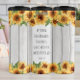 Dieses aufregende Bild zeigt ein ermutigendes Schriftzeichen-Zitat vor einem rustikalen Hintergrund aus weißem Holz. Umrahmt von hellgelben Sonnenblumen und grünen Blätter. Der Text "SEID STRONG SEIN MUTIG SEIN, GEFÜHL IST MIT EUCH, WO IMMER DU JOSHUA 1:9 GEHST" dient als mächtige Erinnerung göttlicher Gegenwart, Kraft und Mut für jede Reise.