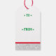 Seien Sie froh auf einem silbernen, Glitzer aussehenden Hintergrund. Auf der Rückseite ein silberner Glitzer Bar unten und "TO" und "AUS" oben. Stilvoll für Ihre Geschenkverpackung in diesem Jahr.