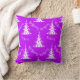Ein buntes lila Weihnachtskissen mit einem Muster moderner Weihnachtsbäume in Weiß vor lila Hintergrund, auf dem sich der Gruß "Be Merry" wiederholte. Dieses Kissen würde ein großartiges Dekor für Ihre Weihnachtsdekoration in diesem Jahr machen.