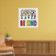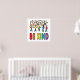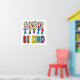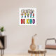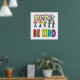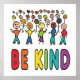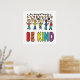 Sei Kind Design besteht aus einer gemischten Gruppe von vielen Leuten über der Nachricht "Sei Kind" in Regenbogenfarben. Ein ethnisch vielfältiges Bild, um Freundlichkeit unter allen Menschen zu suggerieren und zu unterstützen.