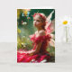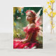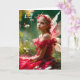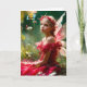 Eine schöne junge Fee mit zarten Flügeln und einem roten Kleid sitzt inmitten eines üppigen Gartens mit Blume und Blätter, die sie umgeben. Sie trägt eine Blumenkrone und blickt gedanklich in die Ferne, gebadet in sanftem, natürlichem Licht. Sie sieht so traurig aus, dass eine vorbeifahrende Biene in Tränen ausbricht.