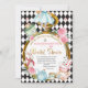 Nicht zu spät Alice im Wunderland Brautdusche Einladung Alice im Wunderland Braudusche Einladung mit einer großen weißen Kaninchenuhr, Alice, verschiedene Blumenarrangements, weißes Kaninchen, ein verrückter Hut, Teekanne, Karten und verschiedene andere Artikel aus der Geschichte. Das Design verfügt auch über ein herausnehmbares Imitat Goldfolienwort in einem kalligraphischen Schriftart und einem schwarzen diamantförmigen Muster Hintergrund.