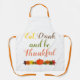 Essen, trinken und sein dankbar Typografie, Kürbis und Blätter Erntedank Schürze. Es enthält den Text "Essen, trinken und dankbar sein" und eine Reihe, die einen Kürbis, Blätter und Eicheln in Herbstfarben enthält.
