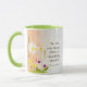 Die Tasse mit der Schrift Kaffee zeigt einfache, weiße, gelbe und violette Aquarellblumen. Es enthält ein inspirierendes Zitat: "Sei heute ein Segen für jemanden", aufgenommen aus den Sprichwörtern 11:25: "Der, der andere segnet, ist überaus gesegnet; wer anderen hilft, wird unterstützt." _
