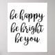 Ein motivierend Zeichen mit schwarzer Pinselschrift, das das Zitat "Sei glücklich, sei hell, sei du" enthält. Ein großartiges Stück, das man sich immer ansehen muss, bevor man seinen Tag beginnt, um dir diesen zusätzlichen Pfeffer zu geben.