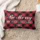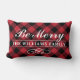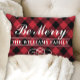 Das saisonale Weihnachtskissen bietet "Be Merry" in weich weißer Schrift mit individuellem Monogramm-Text und einem rustikalen roten und schwarzen Büffel karierten Karo gemusterten Hintergrund.