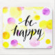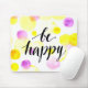 Inspirierend Zitat der modernen Kalligraphie - seien Sie glücklich - an rosa und gelbem Aquarellpunkthintergrund | Bigstock® - alle Rechte vorbehalten.
