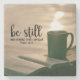Der Untersetzer aus Inspirationsschriftsteinen zeigt eine friedliche Szene einer offenen Bibel, die neben einer Tasse dampfend heißes Getränk, vielleicht Kaffee oder Tee, auf einem Geländer über dem Wasser sitzt. Es enthält Bible Verse Psalm 46:10, "Sei still und weiß, dass ich Gott bin." *