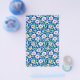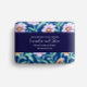 Seifenverpackung mit lila und beige Blume auf marineblau Untergrund.