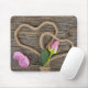 Rosa Rose und Blütenblätter mit Seidenherzen auf Holz.