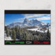 Postkarte mit den Langkofel (Sassolungo) Dolomiten und Bäume im Schnee auf der Seiser Alm in Südtirol, Italien im Winter mit schwarzer Grenze und dem Text: "Seiser Alm".