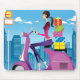 Seitenansicht der Frau mit Geschenken auf Roller. Copyright: Eastnine Inc.