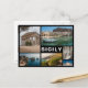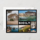 Postkarte einer Collage mit mehreren Fotos von Stränden, römischer Tempel, Scopello, Salzpfannen und Cefalù auf der Insel Sizilien in einem schwarzen Rahmen mit dem Text: "Sizilien".